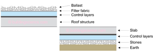 Lstiburek describes first the roof adequate build-up (image above to the left) and then the slab in contact with the earth (image to the right), to find out a striking similarity between those two and with a perfect vertical wall: